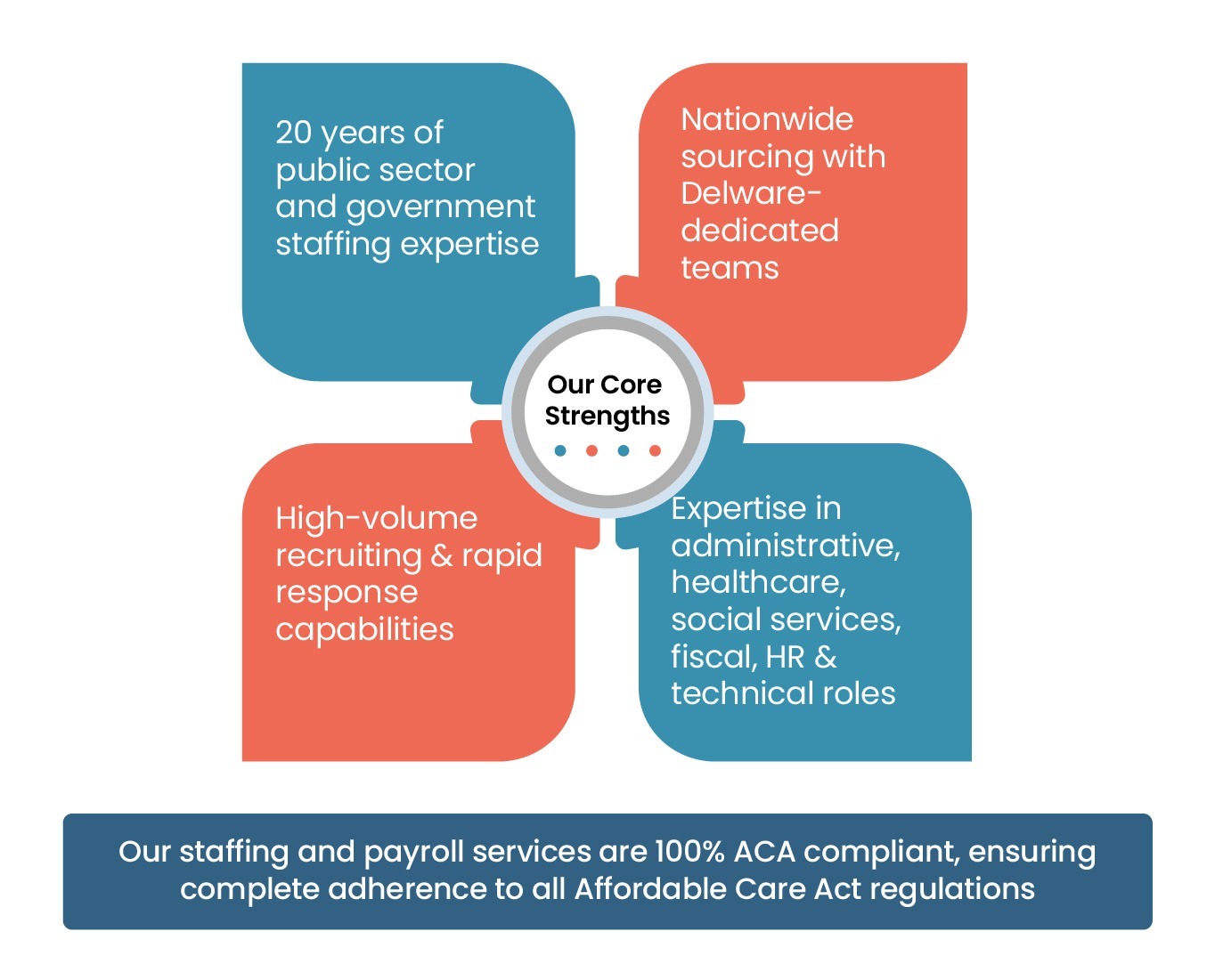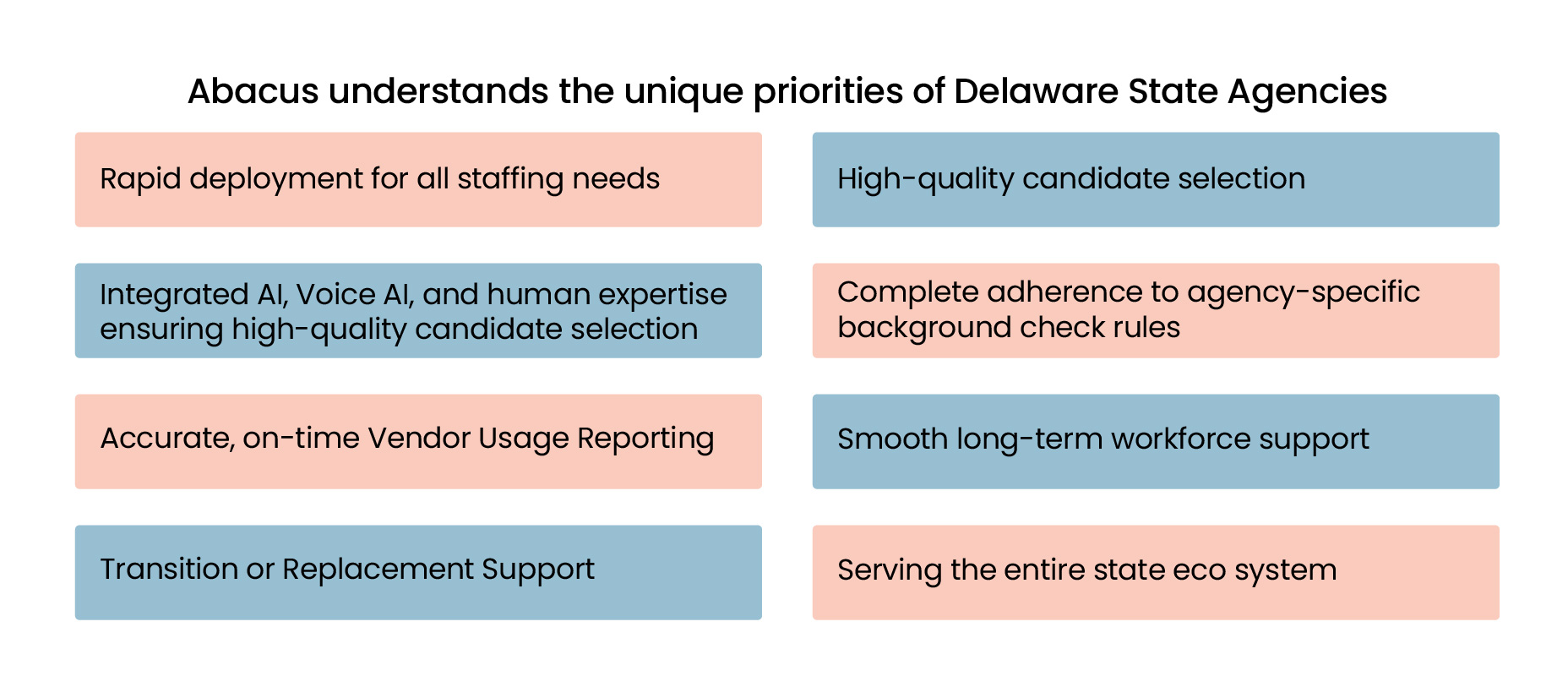 For two decades, Abacus has supported state governments nationwide with reliable, compliant, and rapid staffing services. As a Minority-Owned, WBE-certified provider, we deliver the scale, speed, and precision needed for Delaware’s most critical programs.