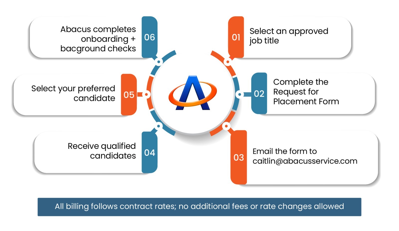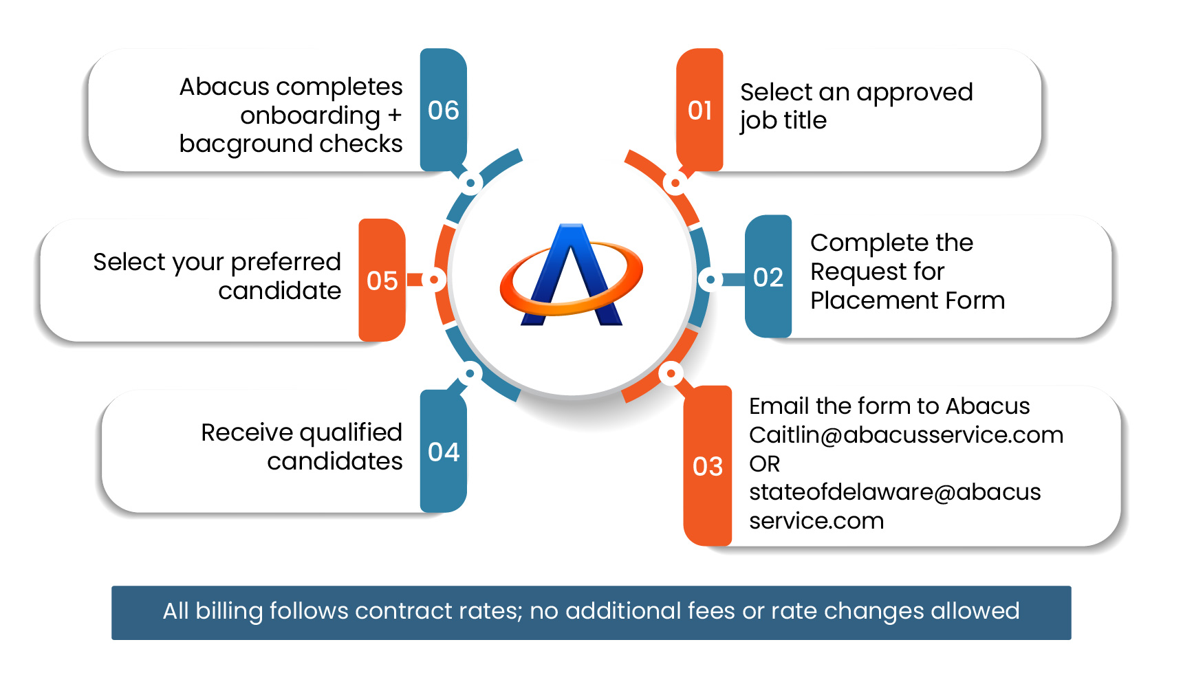 Abacus Service Corporation is an approved vendor for the State of Delaware under contract GSS25112-TEMP_EMPL (Category TEMP_EMPLV03), delivering high-quality temporary staffing with 20years of public-sector expertise.